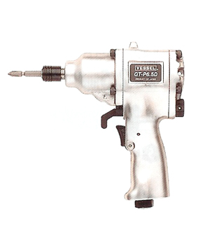 VESSEL 冲击式气动起子利用转子旋转的锤子触到的冲击产生强力紧固的构造⑴以小型,轻量的强力冲击得到紧固力。⑵坚固深度尽快贯彻为作业性能。⑶因为中双击锤子(1转2打式)可得到稳定的紧固。 型号 适用螺丝mm 空载转数 耗气量 气管接口 全长 重量 普通螺丝 自攻螺丝 木工螺丝 螺栓 rpm m3/min mm g GT-S6.5D 6.0-8.0 4.0-4.5